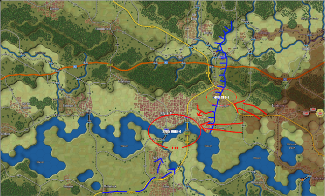 1/27th MRR are equally recovered from their ordeal of breaching the obstacle belt in the morning, despite having taken such a drubbing from mortars while doing so. They, along with the long-idle "demonstration" force, will attack in conjunction with the forces from Sud Rinteln. The intent is to take the eastern bridges and then roll up the enemy flank, fighting along the northern shore of the Weser where adequate cover can be provided by the armour.